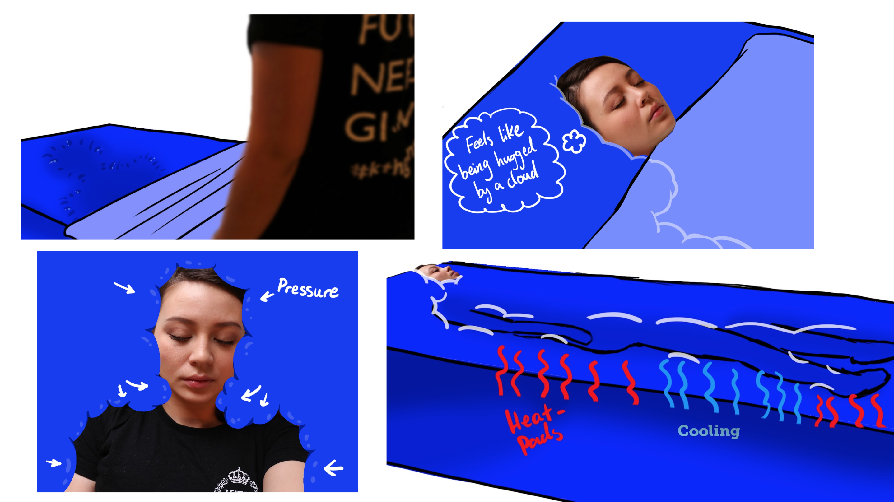 "The cocoon" consists of a bed one can lie in and be enveloped by soft materials shifting in temperature and applying pressure to release tension. While this design addresses a desire present during menstruation, its heating and cooling sensations can also be desired during the rest of the menstrual cycle.